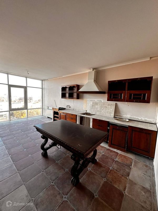 Большая кухня-гостиная с панорамными окнами с прекрасным видо...