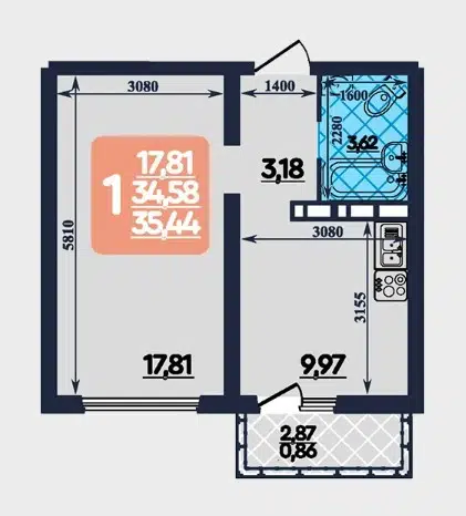 Комната – 17.81 м², Кухня-гостиная – 9.97 м²,
