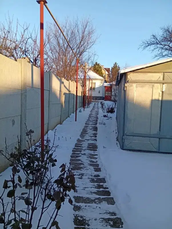 Двор вымощен плиткой, на участке расположен металлический гараж. Участок огорожен бетонным забором.