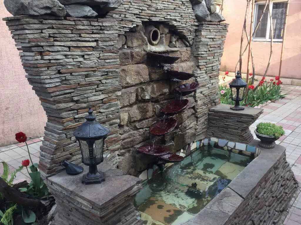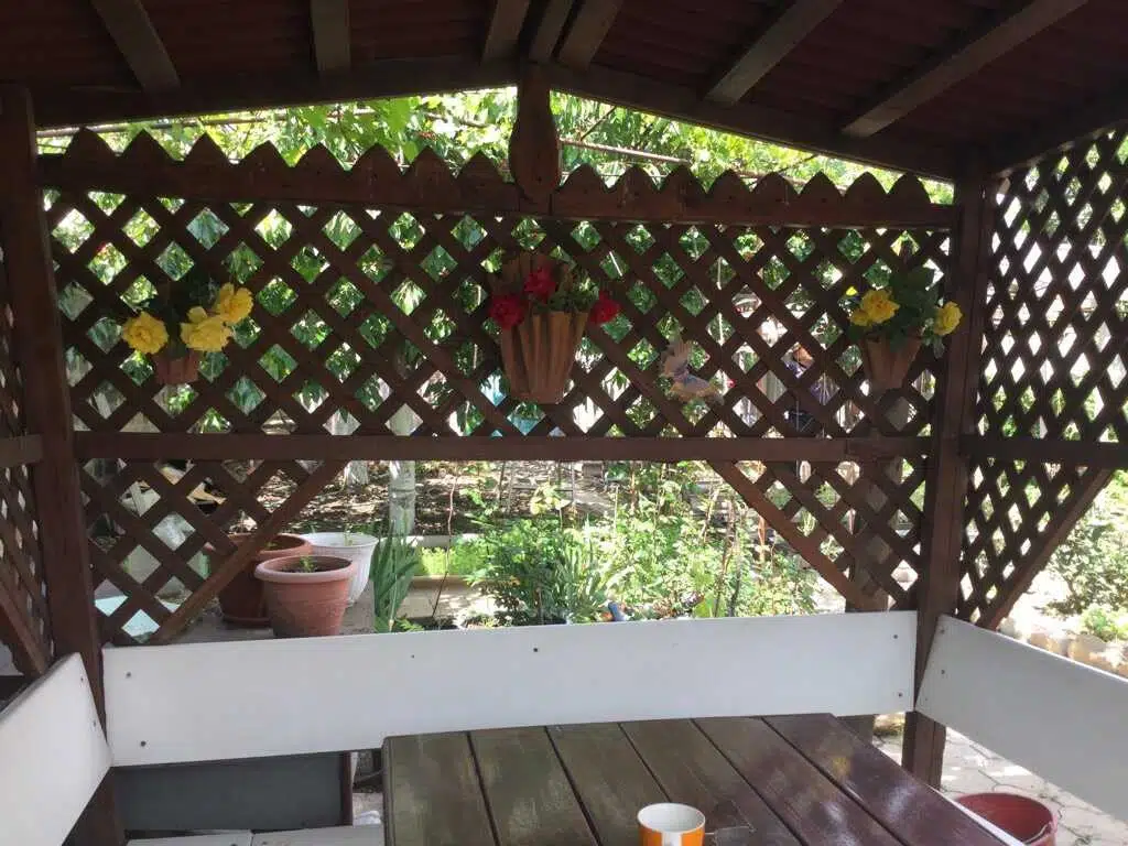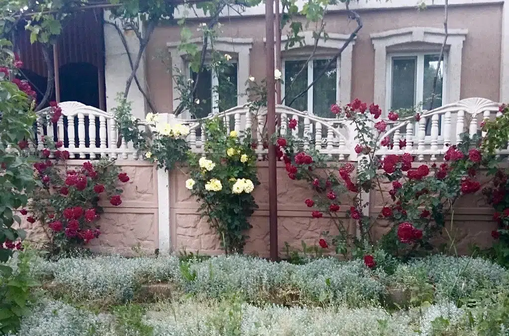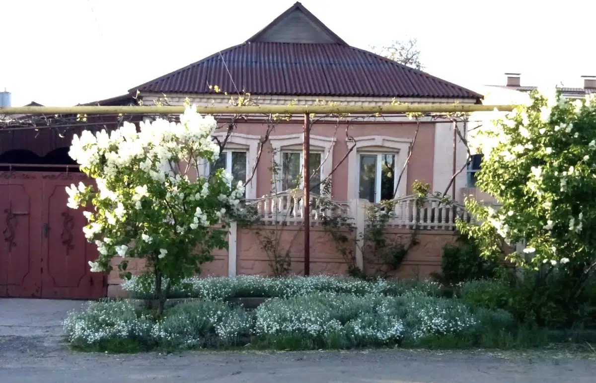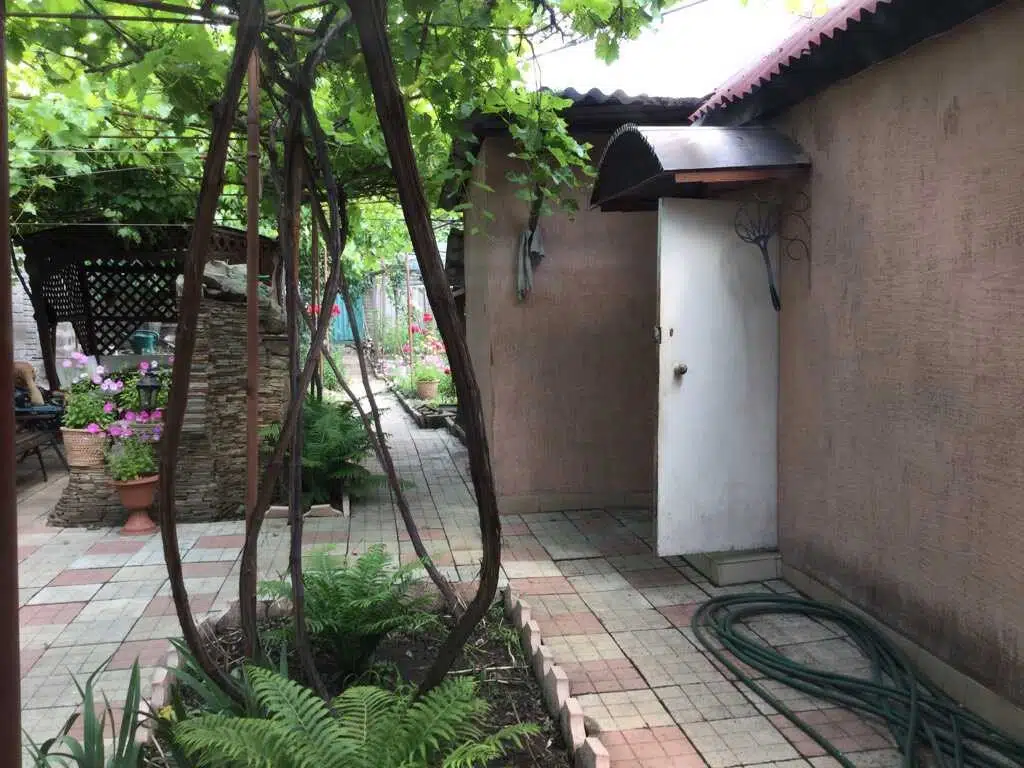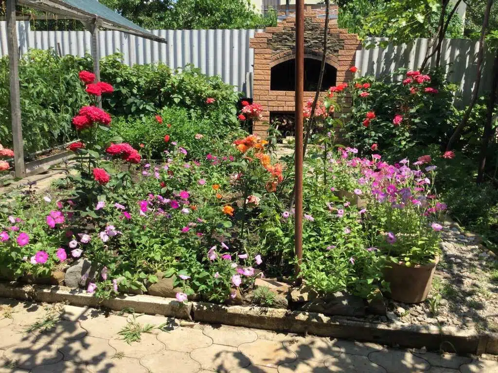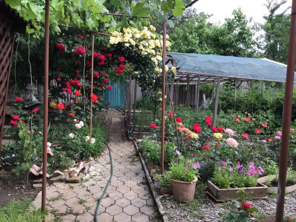 На участке ухоженный сад с разнообразными цветами. Есть зона отдыха с навесом и мангалом. Также на территории растут виноградные лозы и другие плодовые растения.