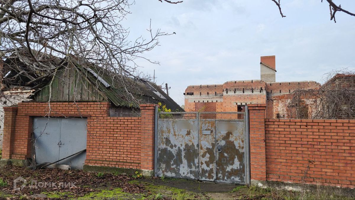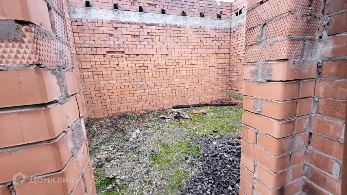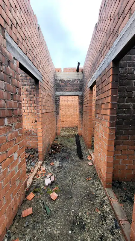 На участке добротная коробка дома из красного кирпича.