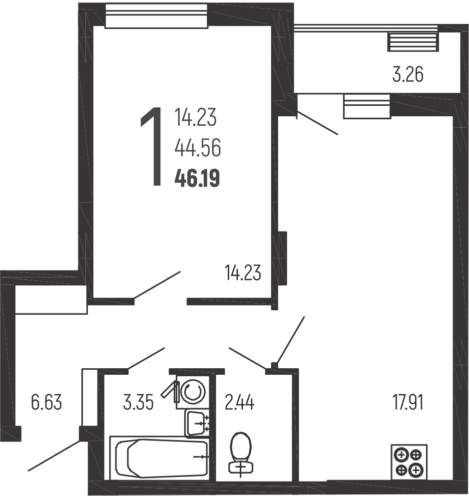 1-комн. квартира, 46,2 м², 1/14 эт.