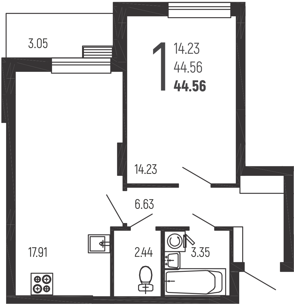 1-комн. квартира, 44,6 м², 1/14 эт.