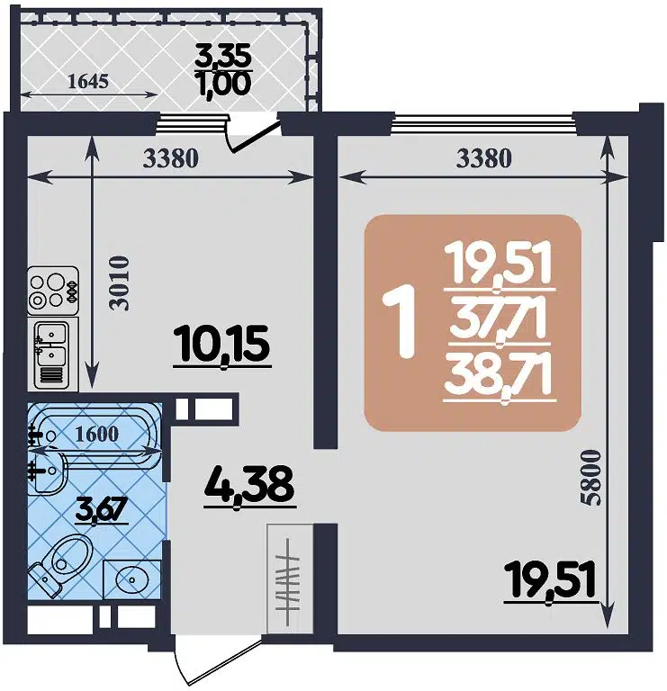 38,8 м² • 2/16 этаж