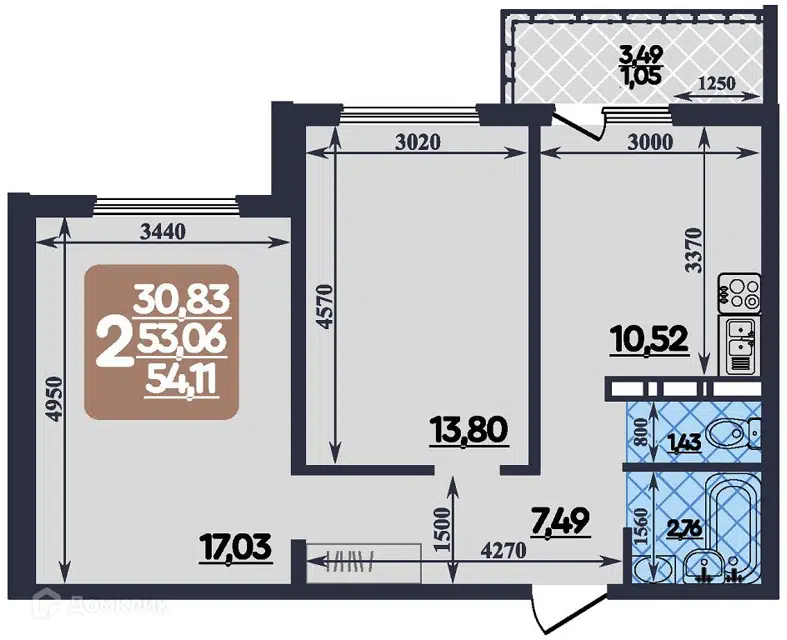 - общая площадь 44,3 м2
