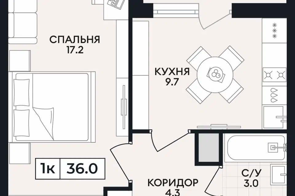Просторная жилая зона занимает около 20 квадратных метров, что позволяет комфортно разместить мебель и создать приятную атмосферу отдыха после рабочего дня. Кухня имеет площадь 9 квадратных метров – достаточно места для приготовления пищи и семейных ужинов.