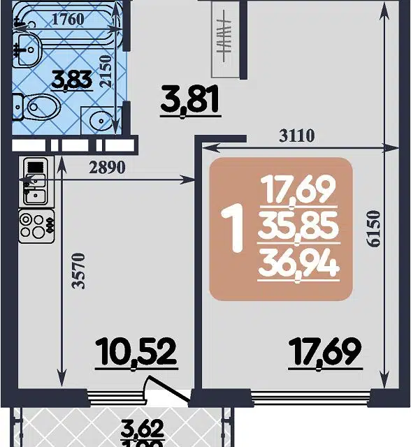 | 🟢 Площадь | от 35 до 46 м2. |