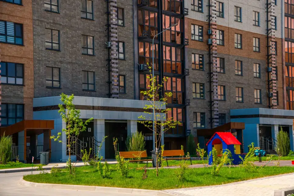 Для удобства жителей предусмотрены стильные входные группы на уровне земли, обеспечивающие безбарьерную среду и свободу передвижения для всех. На территории комплекса обустроены спортивные и игровые площадки, выполнено ландшафтное озеленение.