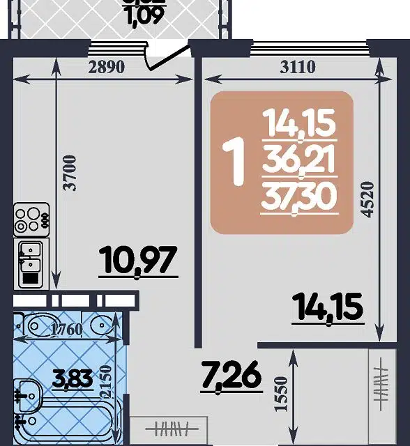 | 🟢 Площадь | от 20 до 37 м2. |