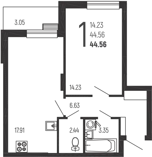 Общая площадь: 44,4 м²