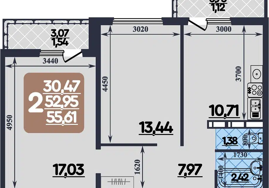 Общая площадь 35,5 кв.м. Жилая 19,4 кв.м. Кухня 8 кв.м.