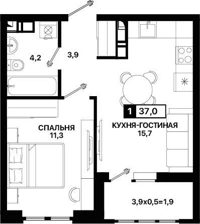• Планировка: кухня-гостиная + прихожая + ванная комната