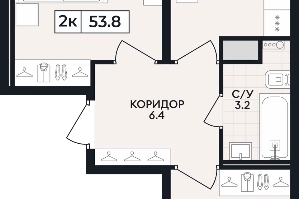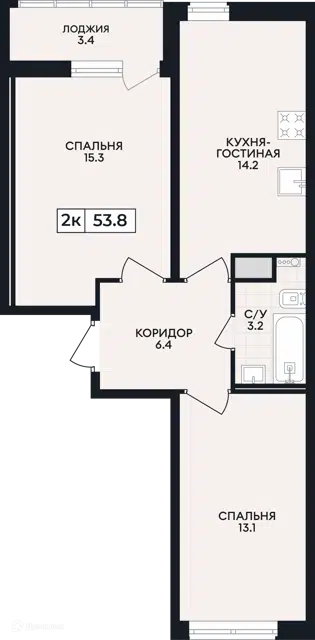 Общая площадь 53.9м2